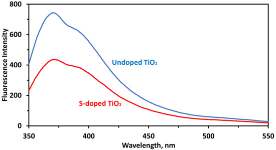 Fluorescence emission spectra of undoped and S-doped TiO2 photoanode thin film.