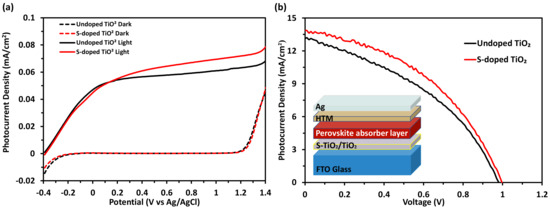 The photo-current response of the undoped and S-doped TiO2 ETLs fabricated by spin-coating and sintered at 450 °C were evaluated using linear sweep voltammetry. The measurements were performed in the dark and under visible light-irradiated environment. The samples were soaked in 0.5 M Na2SO4 solution at a scan rate of 20 mV/s, and the results are displayed in Figure 6a. At 1.0 V, the photo-current densities of the un-doped and S-doped samples were 0.0611 mA/cm2 and 0.0695 mA/cm2 (13.75% increase), respectively. Hence, the incorporation of S in the TiO2 lattice increased the number of charge carriers (electron/hole pairs) in the photo-catalytic reaction of the thin film [23]. A previous study has reported similar responses, in which an increase in the photo-current to a certain extent was observed when the S content was increased, and a higher loading would be detrimental towards the photo-current readings due to the charge recombination of the electron-hole pair [31]. Thus, the incorporation of S as dopant could serve as a beneficial component to increase the photo-current in the thin film.