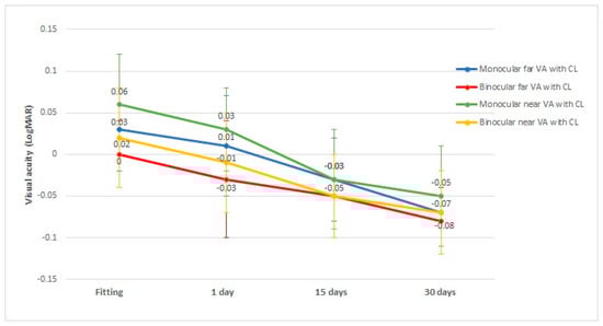 Changes in the visual acuity with contact lens measured at the different visits of the current clinical study. Abbreviations: CL, contact lens; VA, visual acuity.