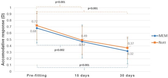 Three consecutive measurements were obtained of the LAG of accommodation, obtaining a within-subject standard deviation of 0.08 and 0.06 D for the MEM and Nott techniques. The accommodative response values obtained with both MEM and Nott methodologies showed a significant reduction with the use of the EDOF CL (p < 0.001). A mean accommodative delay (LAG) of 0.68 ± 0.22 and 0.72 ± 0.23 D was measured in the baseline visit with the MEM and Nott techniques, respectively. After 30 days of CL wear, the mean accommodative LAG decreased to 0.32 ± 0.17 and 0.37 ± 0.20 D with the MEM and Nott techniques, respectively. Figure 2 shows the decrease in the accommodative delay.