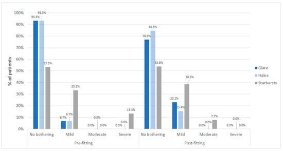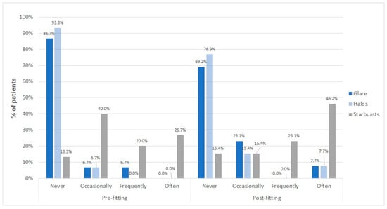 Occasional or frequent perception of glare was reported before the fitting by 13.4% (2 of 15) of participants, whereas this percentage increased to 30.8% (4 of 13) after 30 days of CL wear (p = 0.902) (Figure 3). Regarding halos, they were perceived by 6.7% (1 of 15) and 23.1% (3 of 13) of patients before and after 30 days of CL wear (p = 0.051) (Figure 3). Starbursts were perceived occasionally or frequently by 86.7% (13 of 15) and 84.7% (11 of 13) of patients before and after 30 days of CL wear (p = 0.087) (Figure 3). Most subjects described these three photic phenomena as not bothersome before and at the end of the follow-up (glare: 93.3% vs. 76.9%, p = 0.569; halos: 93.3% vs. 84.6%, p = 0.657; starbursts: 53.3% vs. 53.8%, p = 0.162) (Figure 4).