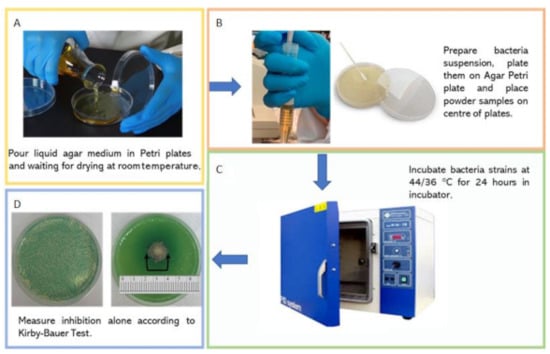 As also reported in [22], the powders were directly placed in the middle of Petri dishes after bacteria plating. The E. coli plates were incubated at 44 °C for 24 h while those of E. faecalis and P. aeruginosa at 36 °C for 48 h. Finally, S. aureus plates were incubated at 36 °C for 24 h. The diameter of inhibition zones (IDs) in relation to Petri dish diameter (PPD) (6 cm) were calculated. Four measures for each sample were carried out to determine the mean Standard Deviation. The whole procedure was sketched in the flow-chart shown in Figure 1.