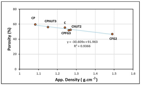 In Figure 2 the correlation between the apparent density and the total porosity for the LWAs analyzed is plotted. Correlation may be described as the degree of association between the two variables considered. It is possible to note an inverse proportionality: increasing apparent density decreases the porosity. It is possible to verify the goodness of the experimental data by the correlation coefficient: R2 = 0.9378. Besides, the regression highlights a linear relationship. The porosity values ranged between 40%–60%, and, as referred above, the lighter materials were more porous.