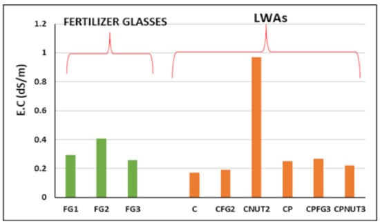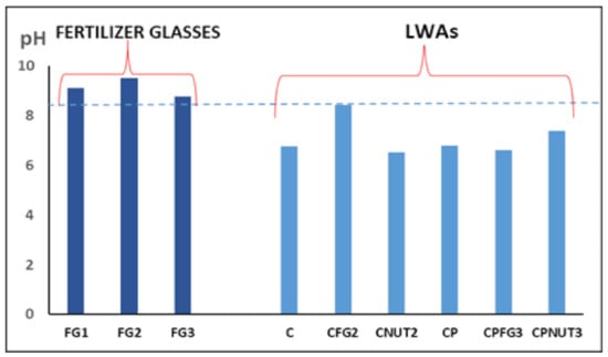In Figure 3 the pH values measured both in an aqueous extract of fertilizer glasses and LWAs are plotted. It can be noted that all glasses compositions displayed pH values higher than those corresponding to LWAs. The glasses compositions were properly designed by the authors to achieve a controlled release over time of P and K and to use them to functionalize LWAs with a specific percentage of K and P as required by the Italian legislation on fertilizers [24]. It is possible to hypothesize that since the glasses contain high percentages of K (12%) and Ca (26%), the release of these elements clearly involves alkaline pH values. Regarding the LWAs samples, all compositions showed pH values within the optimal interval (6.5–8). The highest value corresponded to the CFG2 composition containing the addition of 50% of fertilizer glass.