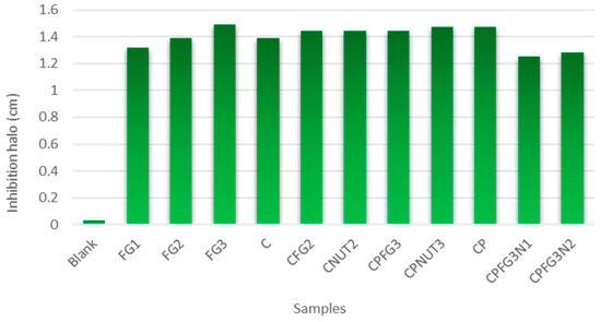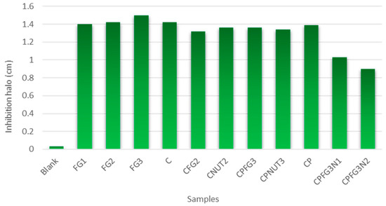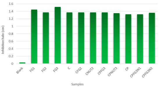 Inhibition zones of the samples tested in presence of E. coli (−).