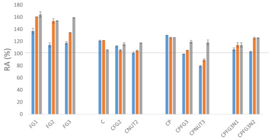 As evidence, CPFG3N1 was the formulation with the highest release of these elements, respectively 130 mg/L of P, 9.52 mg/L of N, and 156 mg/L of K, followed by CPFG3N2 composition. On the other hand, FG1, FG2, and FG3 released high amounts of K.
