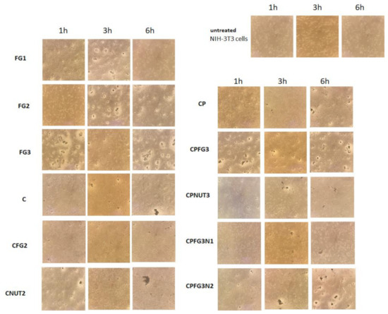 Representative images of untreated NIH-3T3 cells and investigated materials-treated NIH-3T3 cells, acquired by Inverted Phase Contrast Brightfield Zeiss Primo Vert Microscope at 1, 3, and 6 h of exposure.