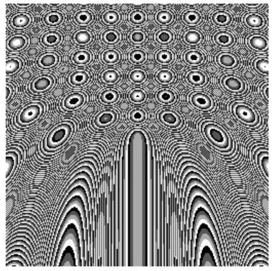We need a diffractive phase element with the transmittance expressed by relation (6), which we refer to as the “diffractive compressing element (DCE)”. This Fresnel diffractive element has a continuous phase profile (kinoform) [13]. Figure 2 shows a quantized version of such an element, where only four phase levels are used. We projected the phase profile onto the closest phase level in the set {0,π/2, π, 3π/2}. We see in the neighborhood of the bottom half of the vertical axis that the profile is similar to that of a one-dimensional Fresnel lens. Over each ring r of the diffractive element, the phase corresponds to a two-dimensional off-axis Fresnel lens, where the off-axis translation corresponds to r. In order to decrease the resolution needed by the Fresnel diffractive element, we can put a spherical lens beside the diffractive element [14,15]. In fact, the distribution of DCE becomes the difference between Figure 2 and the distribution of the inserted lens. It is worth noting that the phase pattern becomes more and more dense in the boundary areas. The smallest feature should be large compared to the wavelength (let us say, more than five times) so that we could remain in the scope of scalar diffraction.