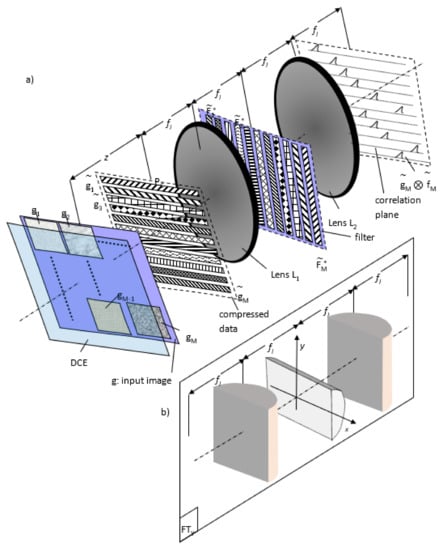 After compressing the input images by means of a multi-faceted diffractive compressing element (DCE), a two-dimensional Fourier transform is performed by means of a spherical lens L1 (Figure 5). Then, the resulting spectra are replicated by a subsystem similar to that of Figure 4. Each replica of one spectrum is multiplied by one one-dimensional pattern from the filter bank to . The correlation product, observed in the focal plane of the spherical lens L2, contains the Fourier transforms of all the products: …, .