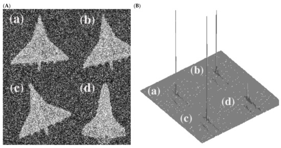 We focus our attention on rotation invariance. The input scene images are presented in Figure 6A. The reference image is shown in Figure 6A-a. Figure 6A-b,A-c are slightly laterally shifted and rotated versions of the reference image, whereas Figure 6A-d is a false image. The energy is normalized for the four images. To test the approach under noisy conditions, significant noise is voluntarily added to the input image. The noise energy is four times bigger than the energy of the useful signal. We designed a binary phase-only filter by projecting the phase profile onto the closest phase level among {0, π}. These kinds of filters can be implemented by a spatial light modulator if a programmable system for pattern recognition is required.
