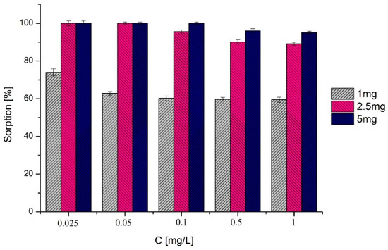 In order to achieve the maximum quantitative recovery in the extraction of bisphenols, different amounts of microgel were tested. Therefore, 1, 2.5 and 5 mg of microgel were applied for the sorption of different concentrations of BPA. Figure 2 illustrates that the more microgel sorbent was applied, the higher concentration of BPA was adsorbed. Although our poly(MEO2MA) microgel had a large adsorption capacity (Qmax in the range of 55 to 159 mg·g−1 for all tested bisphenols [28]), 1 mg of microgel was not sufficient for the total sorption of even the smallest concentration of BPA. The amount of 5 mg of the microgel provided the best sorption of BPA, which remained above 95% in the range from 0.025 to 1 mg·L−1, while for 2.5 mg the sorption for the concentration higher than 0.025 mg·L−1 gradually decreased to 90%. As our goal was to use the microgel for the sorption of several bisphenols, 5 mg of microgel sorbent was selected for further experiments.