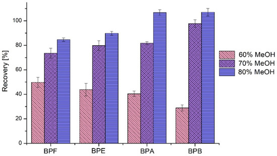 The elution solvent must be capable of disrupting all retentive interactions between the analyte and sorbent but not too strong as to remove tightly bound contaminants. One milliliter of pure methanol was sufficient to obtain a complete desorption for all the analyzed bisphenols, which were adsorbed on the microgel. However, when 100% organic solvent is injected into liquid chromatography, the peaks for analytes become broad and asymmetric; this is why the different compositions of methanol and water were also studied for bisphenols removal. In order to obtain a 5-fold preconcentration of 1 mL of the sample, 200 µL of each methanol/water mixture was tested for the elution of all bisphenols. As presented in Figure 3, 80% of MeOH (80/20 methanol and deionized water) obtained the best desorption efficiency for all four bisphenols. This is why it was selected as the optimum elution solvent for further extraction studies.