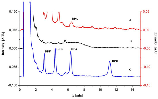 LC-FLD chromatograms of (A) liquid pineapple sample after microgel preconcentration (with the visible peak for BPA, tR = 6.39 min), (B) liquid pineapple sample before preconcentration procedure and (C) liquid pineapple spiked with the standard solution of bisphenols (0.5 mg·L−1).