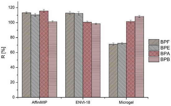 As presented in Figure 5, both cartridges showed very good recoveries (101.3–115.6% for Affinimip® and 98.5–112.8% for Supelclean™ ENVI-18) for preconcentration of 10 mL of fruits in syrup spiked with 50 µg·L−1 standard solution of investigated bisphenols. However, the Supelclean™ ENVI-18 cartridge was easily clogged with the matrix of the food sample, which prolonged the SPE procedure. The recoveries obtained for our microgel SPE procedure were comparable (from 71.2 to 108.3% for all bisphenols). However, lower recoveries (71.2–72.4%) obtained for BPE and BPF were caused by weaker retention of both bisphenols on microgel as small amounts were found in the effluent. In order to verify the results obtained on the microgel, all the samples where BPA was found (mandarin, pineapple, mushroom, peach and pickles) were also preconcentrated by using Affinimip® cartridge, and the results were consistent with each other. For example, by using Affinimip® cartridge for preconcentration, the determined amount of BPA in pickles was 10.9 µg·L−1 and 19.8 µg·L−1 for peach. These results differ only by less than 10% to the concentrations determined after microgel extraction (Table 2).