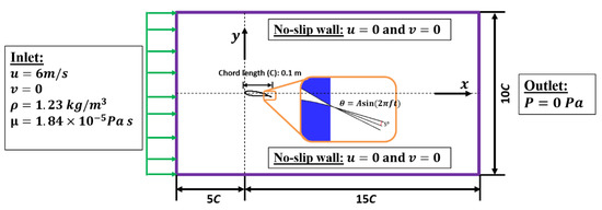 The NREL’s S833 airfoil has been extensively used to design wind turbine blades [26]. However, with the rapid development of wind farms, noise emission has become a significant issue. The ultimate goal of this study is to explore a novel airfoil design to reduce the noise generation associated with the shedding vortices from wind turbine blades. Thus, the S833 airfoil is selected to investigate the aerodynamic interactions between the vortex shedding in the wake and the flapping fringe installed at the trailing edge. Two-dimensional CFD simulations are performed for the airfoil model. The dimensions and boundary conditions applied in simulations are shown schematically in Figure 1.