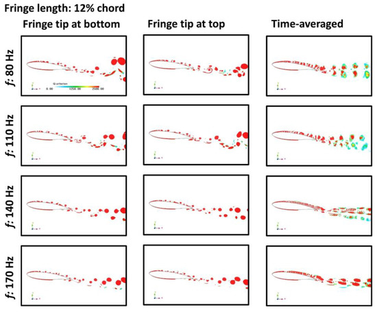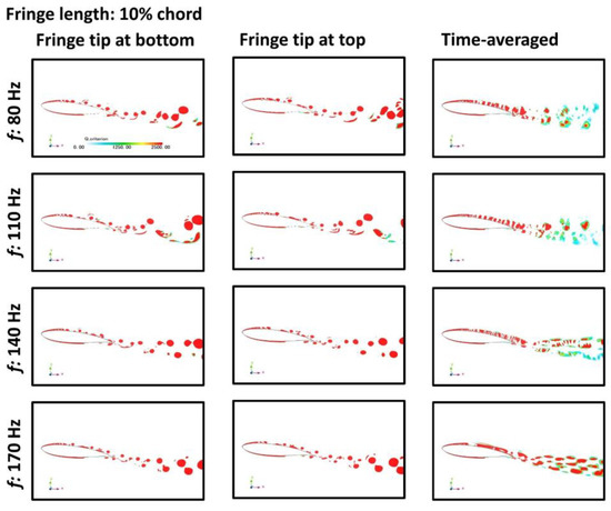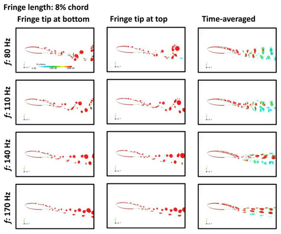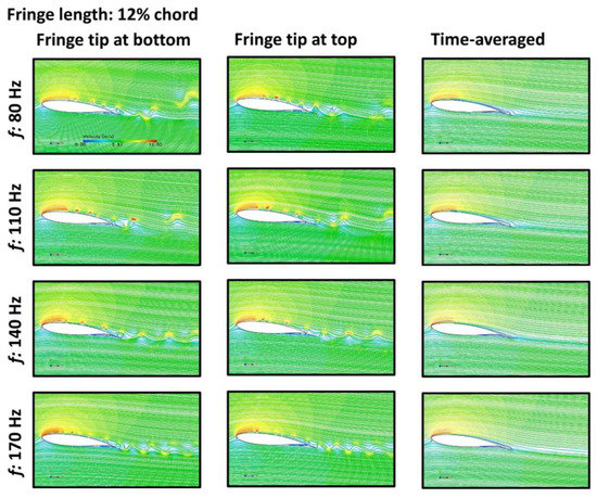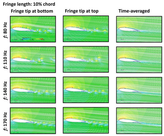 The Q-criterion (around the airfoil and in the wake) and velocity distributions for the airfoil model with the fringe length of 8% of the chord at four different fe are presented in Figure 3, Figure 4 and Figure 5. The large-scale vortices initiated over the upper surface of the airfoil were broken up into smaller scale vortices compared to the shed vortices of the bare airfoil model. The flapping motion at the flapping frequency of 80 Hz creates an irregular pattern of vortices compared to the cases with higher frequencies (110–170 Hz), as shown in Figure 3. The time-averaged Q-criterion distributions demonstrate an accelerated decay of vortices by the extended fringe with a low flapping frequency (80 Hz), resulting from the unstructured small-scale vortices being shed irregularly. This observation might be induced by the velocity “offset effect” between induced vortices and the shed vortices from upstream. With the increased flapping frequency, the vortices decayed slowly. This might be attributed to the fact that the contribution from the flapping fringe to the overall swirling strength becomes more dominant with the increased flapping frequency.