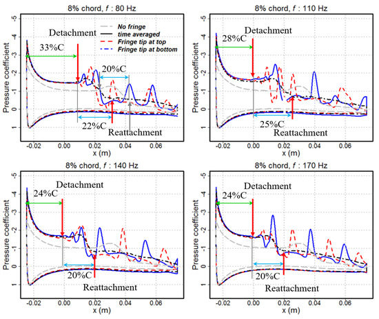 The pressure coefficient distributions over the airfoil model with the fringe length of 8%C at four flapping frequencies are compared, as shown in Figure 6. The instantaneous pressure coefficient distribution shows a significant fluctuation corresponding to the shedding vortex over the upper surface as compared to the averaged pressure distribution over the baseline airfoil model. An obvious phase difference of the pressure oscillations can be observed between the case with the fringe tip at the bottom position and that with the fringe tip at the top position. The phase difference is more complicated in the region of the separation bubble compared to the region downstream of the separation bubble. By comparing the time-averaged pressure distributions, one can observe that higher flapping frequencies tend to move the separation bubble forward (towards the leading ledge). The distance from the leading edge to the take-off point of the separation bubble decreases from 33%C to 24%C as the flapping frequency increases from 80 Hz to 170 Hz. The separation bubble length is about 22%C, 25%C, 20%C, and 20%C for the case of fe = 80 Hz, fe = 110 Hz, fe = 140 Hz, and fe = 170 Hz, respectively. Overall, higher flapping frequencies tend to generate a lower time-averaged pressure coefficient over the upper surface, which would result in an increase in the lift coefficient.
