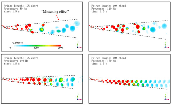 Q-criterion distributions around the airfoil model with the fringe length of 10% chord at different flapping frequencies.