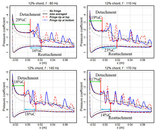 However, it is difficult to differentiate the influence of the fringe tip position (fringe tip at the top or bottom positions) on the distribution of the Q-criterion. Thus, the instantaneous and time-averaged flow fields around the airfoil were plotted to illustrate the effects of the flapping fringe on the flow field, as shown in Figure 5. The flapping motion induces movement of the separation bubble towards the leading edge of the airfoil for all cases (Figure 5). The existence of the separation bubble caused fluctuated pressure forces on the upper surface, reflecting the unstable pressure distribution over the airfoil model, as shown in Figure 6. Higher flapping frequencies tend to increase the velocity over the top surface of the airfoil, and, as a consequence, it results in a decrease in the aerodynamic pressure. Subsequently, the pressure drop could lead to an increase in the lift coefficient, and a decrease in drag coefficient. It is indicated that the pressure acting on the top surface tends to be small when the flapping fringe tip is at the bottom position, in contrast to that when the fringe tip is at the top position.