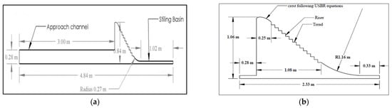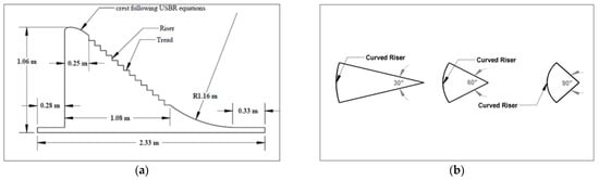 Two scaled down models were adopted. The first model (Calibration model) as previously discussed was created from the information provided in the paper [], while for the second model, dimensional analysis was performed to get its dimensions. The second model, which was further processed and simulated, was brought from spillways of Khanpur Dam Taxila, Pakistan. General features of Khanpur dam are given in Table 2. Using Froude’s number analysis of model generation, a model was constructed in the ratio of 1:50. Head and number of steps were considered in a way to minimize the scale effects and present the skimming flow along the steps []. General features of Model 2 are presented in Table 3. Figure 1a,b presents the pictorial view of Model 2 and the magnitude of curvature induced in each riser of Model 2, respectively.