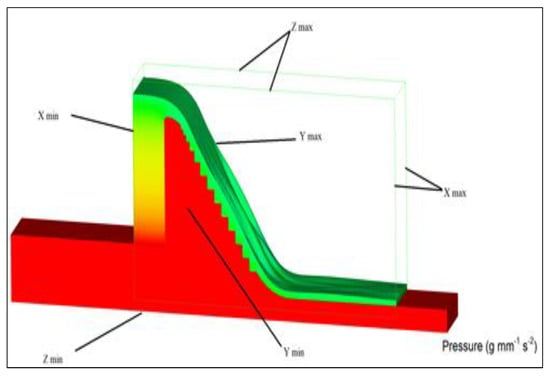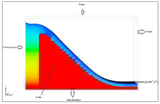 In physical modeling, stepped spillway model made with plexiglass is placed into a flume. The flume presents the constraints/obstructions on the sides. Therefore, in our study, the wall is considered on the sides and bottom of the model. Figure 3 and Figure 4 present the boundary conditions for Model 2 and Model, 1 respectively. On the other side, at the top of stepped spillway, atmospheric pressure is considered as the boundary condition. Moreover, fluid fraction is put equal to zero as at the top boundary of the mesh has no fluid. The commercial code FLOW 3D was used to perform this study. It is the commercial code that can solve 3D Reynolds-averaged Navier–Stokes (RANS) equations for one fluid including the RNG k-ε turbulence model numerically. FLOW 3D uses TurVOF method for interface tracking [].