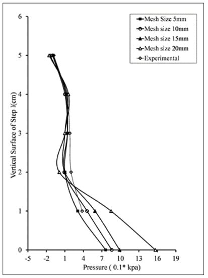 To carry out the confidence in the study, a calibration process is always needed. For this purpose, experimental results were taken from a previous paper [] and were compared with the same model results from FLOW 3D. The authors in [] presented experimental results for the pressure profiles along the horizontal and vertical surfaces of three steps, i.e., step nos. 5, 9, and 13 of the stepped spillway model, along with water surface elevation over the stepped spillway model, for a flow rate of 0.027 m3/s. The same model geometry was constructed in SOLIDWORKS software package and was named as Model 1. The geometry file was imported to numerical solver software package FLOW 3D. Grid Sensitivity analysis was performed at step no. 13 (for which the results are discussed later). Different mesh sizes 20 mm, 15 mm, 10 mm, and 5 mm were opted to run the simulation. It was 5 mm mesh which gave the lowest error (less than 10%) when the values were compared to experimental results for step no. 13 taken from [].