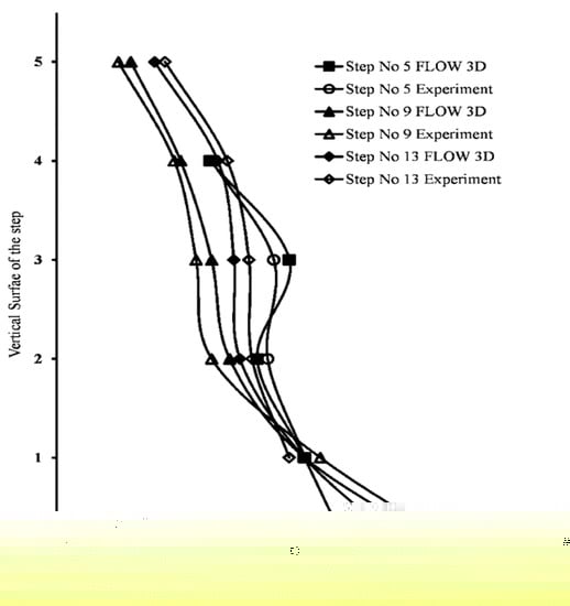 Similarly, Figure 7 presents the comparisons of pressure profiles over the vertical surface of step nos. 5, 9, and 13, respectively. Experimented values were taken from the paper, while for the vertical surface pressure profiles from FLOW3D, the value of pressure at the nodes near the vertical surface was considered. Similar to the case of horizontal pressure profiles, vertical pressure profiles also present a good agreement.