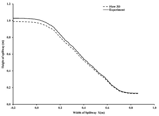 The three values along the free surface elevation were taken and then were averaged. Moreover, FLOW3D presents values of free surface elevation at every node, which is at distance of 5 mm (as the mesh size is 5 mm). A comparison is presented in Figure 8. A good agreement values can be seen.