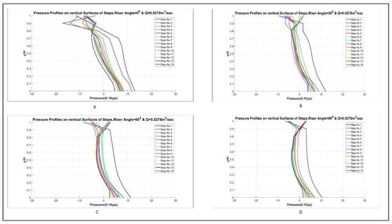 Pressure profiles for (A) simple stepped, (B) 30°, (C) 60°, and (D) 90° curved risers spillway for the head of 120 mm.