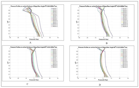 Pressure profiles for (A) simple stepped, (B) 30°, (C) 60°, and (D) 90° curved risers spillway for the head of 200 mm.