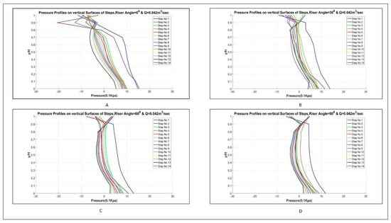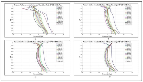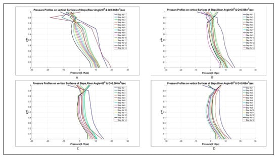 Pressure profiles for (A) simple stepped, (B) 30°, (C) 60°, and (D) 90° curved risers spillway for the head of 100 mm.