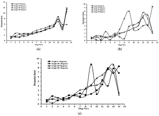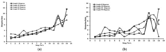 From Figure 15a,b, it is evident that dissipation increases at the lower steps. Moreover, for the curved risers, this increase in dissipation is shifted to other steps. It can be seen in that for a 90-degree curved riser for each unit discharge, increase in energy dissipation is smooth. Ideally, a stepped spillway dissipating equal energy at each step is the best spillway as it causes less cavitation and is thus less prone to damage. A regular behavior in the nature of EDD is missing. Figure 16a,b show that energy dissipation increases while going down along the steps. Moreover, in contrast to this, for other flow rates, this shifted to higher steps in the curved risers.