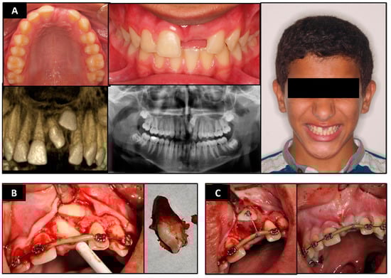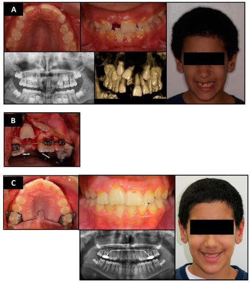 Tooth impaction is characterised by eruption failure once the normal time of eruption has passed and adjacent and antimere teeth have properly erupted [1,2,3]. Tooth eruption is a unique biological process characterized by the movement of a tooth from the alveolar process to its functional position in the oral cavity. The accurate eruption mechanism still needs elucidation [4] and depends on the correlation between space in the eruption course, created by the crown follicle, eruption pressure, and the ability of the periodontal ligament to adapt to the eruptive movement. The dental follicle is mandatory and plays a major role in the coordinated alveolar bone resorption and formation. A finely tuned genetic approach of parathyroid hormone 1 receptor (PTH1R) and parathyroid hormone-related peptide (PTHrP) have been shown to be important in bone remodelling during eruption [5]. Impacted permanent teeth are relatively common at the early mixed dentition age [6]. The most commonly impacted maxillary tooth is the canine, occurring in less than 2% of the general population, followed by the central incisor with a frequency of 0.06% to 0.2% [7,8]. Factors that influence the eruption process of the teeth are local, systemic, and congenital [9]. Some issues have been suggested that result in maxillary central incisor impaction. These could be trauma to primary teeth/dilaceration, a congenitally displaced incisor, ectopic development, cysts, tumours, over-retained or early lost primary teeth, dense mucoperiosteum, tooth agenesis, syndromes, lack of space, ankylosis, and abnormal morphology [9,10]. Two of the most common reasons for tooth impaction are supernumerary teeth and odontomas. Supernumerary teeth frequently traced in the mixed dentition period in the maxillary incisors [11,12,13,14] may result in delayed or ectopic eruption of the permanent incisors [15] and extraction should be considered [13]. Odontomas are the most common benign odontogenic tumours (22%) with no gender tendency [16]. They are usually clinically asymptomatic, but often associated with tooth eruption disturbances [17]. The anterior maxilla is an area of high aesthetic demand and, consequently, treatment of unerupted maxillary incisors requires a well-synchronised multidisciplinary approach to obtain an acceptable aesthetic and functional result as soon as possible [10].