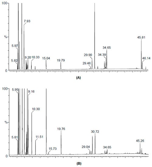 Total ion current (TIC) chromatograms on a DB-1column of the essential oil from Azorean Cryptomeria japonica leaves, isolated using the hydrodistillation (A) and water-steam distillation (B) methods.