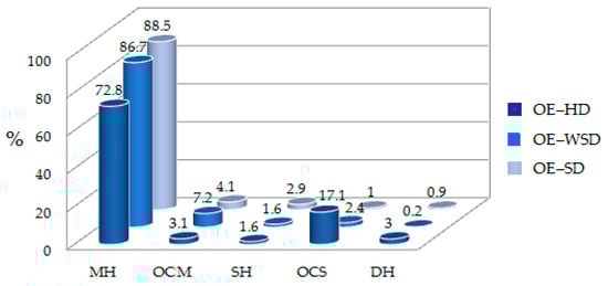 Grouped components (%) of leaf essential oil (EO) from Cryptomeria japonica growing in northeast region of São Miguel Island (Azores), isolated by hydrodistillation (HD), water-steam distillation (WSD), and industrial steam distillation (SD). Data from the OE–SD sample were provided by Marques, S.A. Legend: MH—monoterpene hydrocarbons; OCM—oxygen-containing monoterpenes; SH—sesquiterpene hydrocarbons; OCS—oxygen-containing sesquiterpenes; DH—diterpene hydrocarbons.