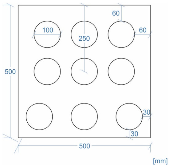 In total, three concrete batches were produced. Out of each concrete batch three cubic specimens with an edge length of 150 mm as well as one plate with dimensions of 500 × 500 × 212 mm3 were cast, each in two layers with subsequent compaction on a vibrating table. A height of 212 mm was chosen to enable grinding of both the bottom and surface of the later extracted drilling cores and gain specimens of a height of 200 mm. The specimens were covered with foil to inhibit dehydration of the surface. After 24 h, the specimens in steel formworks (cubes) were demoulded. Moreover, the upper surface was ground to ensure a flat surface with a good connection to the electrodes and afterwards stored underwater. The plates were left in the formwork to simulate a hardening of structural elements such as floor plates or walls and were stored at a climate of 20 °C and 65% relative humidity. After 14 days, nine drilling cores with diameters of 100 mm were extracted out of each concrete plate. Thereby two different edge distances were used. The first six specimens were drilled with edge distances to the formworks of 60 mm, appropriate to the length of the fibres, while the last three cores were drilled with edge distances of 30 mm, appropriate to half of the fibre length. A schematic figure of the arrangement of the drilling cores is presented in Figure 1. After drilling, the lower and upper surfaces of the cores were ground analogue to the cubic specimens and the specimens were stored underwater.