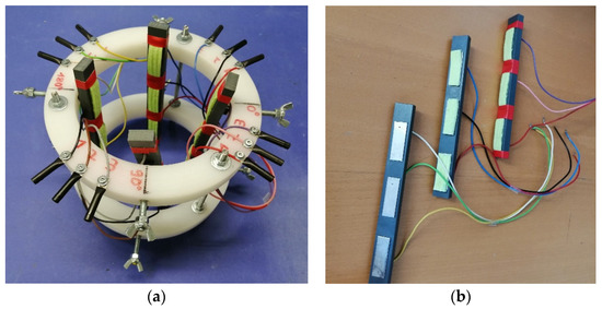 After extensive tests of the setup for cylindrical concrete specimens in combination with the breadboard [2], a cylindrical frame for the analysis of drilling cores was developed (see Figure 3a). The frame was applicable for concrete specimens with different dimensions, such as a diameter of 100 mm or less. The setup consists of stainless steel electrodes with dimensions of 40 × 10 mm2 in three heights, which are arranged in angular distances of 90°. Those electrodes were covered with sponge cloths and isolated with insulating tape to inhibit a short circuit (see Figure 3b). The electrodes were fixed with screws to a circular frame, so they could be adjusted to the specimen’s dimensions, and a reproducible contact pressure could be ensured. The whole setup can be connected to the breadboard, so measurements of various combinations of the twelve electrodes are possible.