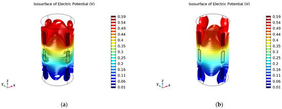 Resulting isosurfaces, calculated by Comsol with different simulated electrical conductivity/resistivity of the electrodes. (a) electrical conductivity of electrodes: 1.4 × 106 S/m; (b) electrical resistivity of electrodes: 100 Ωm.