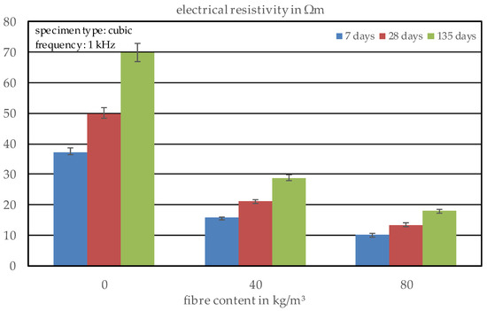 In addition to the production of the concrete plates, where the drilling cores were extracted, three cubic specimens with edge lengths of 150 mm were produced out of each concrete batch to analyse the electrical behaviour of the concrete in the early age and the changes with ongoing aging. For this purpose, the cubes were analysed via the basic test setup (Section 2.2.1) in concrete ages of 7, 28, and 135 days. The electrical resistivity was calculated, and the fibre content and fibre orientation were estimated according to Section 3.2. Since the specimens were stored underwater for the duration, a good conductivity of the concrete was reached, and thus no negative effects of the coupling of the electrodes to the concrete surface were observed. Figure 5 shows the results of the measurements. As already explained, the resistivity of the PC, as well as of the SFRC, increases with increasing concrete age and a higher fibre content results in a significantly lower resistivity due to the conductivity of the fibres inside the concrete matrix (see [1,21,33]).