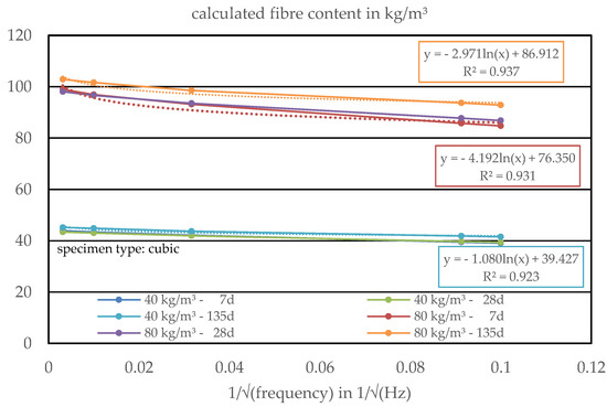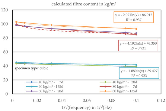 Calculated fibre content of the cubic specimens at varying frequencies of the alternating current of the samples with a fibre content of 80 kg/m3 (dotted lines represent the fitted trend lines according to the equations given in the corresponding graph).