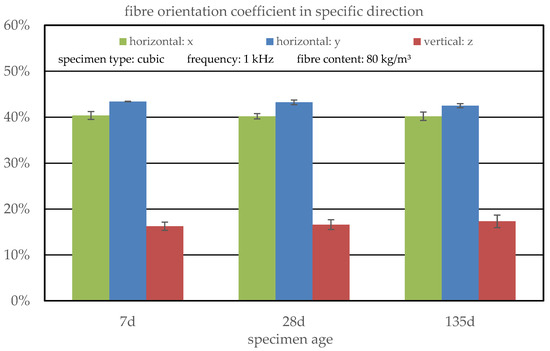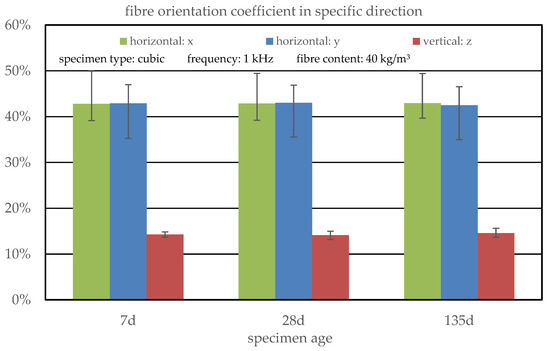 While the frequency of the alternating current, as well as the age of the specimens, showed an influence of the calculated fibre content, for the fibre orientation, both parameters seem to be independent, as it was already occupied in the earlier tests (see [2]). Both the age of the specimen and the frequency of the alternating current led to results for the fibre orientation inside the concrete cubes with no significant variations. For a fibre content of 40 kg/m3, much more fibres are oriented in the horizontal directions with a proportional distribution of approximately 42% in each of the horizontal directions (see Figure 8). Since the concrete was compacted by a vibration table in a vertical direction, this result was expected. In addition, it can be analysed that there is a higher scatter in the horizontal directions than in the vertical one with fibre orientation coefficients of 35% to 50%.