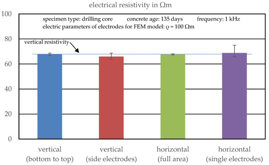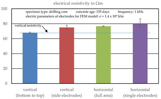 Figure 10 shows the comparison of the vertical resistivity, calculated with the easily calculated k-factor, and the vertical and horizontal resistivities of the drilling cores, calculated of the results of the FEM analysis, with the electrodes, simulated with the electric parameters of stainless steel. It is clear to see that the electrical resistivity of the nine drilling cores in a vertical direction, measured with the basic test setup, is approximately 68 Ωm with a very low deviation. The Comsol model with the electrodes’ electrical conductivity set to the one of stainless steel with 1.4 × 106 S/m results in calculated resistivities that are significantly higher, and additionally have a higher scatter, based on a large number of test directions and the fact that only a part of the inhomogeneous specimen is analysed. Due to the good conductivity of the electrodes in the model, in this case, the geometry factors that are calculated are too high and do not represent the realistic behaviour of the test setup and the specimen. In particular, the vertical resistivity and the horizontal one with single electrodes show the largest deviations, which can be explained by the higher number of possible measurement directions and the lower specimen volume that is observed each time.