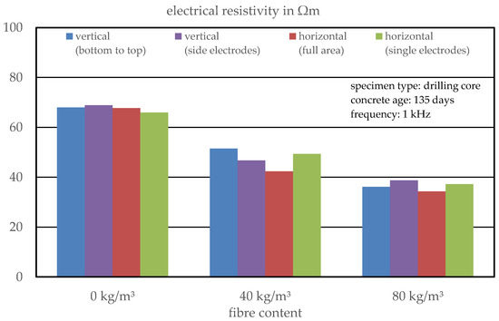 As already seen for the cubic specimens, an increase of the fibre content results in a lower electrical resistivity (see Figure 12). In contrast to the prior results, the difference between the results of different fibre contents and the PC is much lower for the drilling cores. As one can see, a fibre dosage of 40 kg/m3 only decreases the electrical resistivity by about 20 Ωm, while another 40 kg/m3 lead to a decrease by about 10 Ωm. For the cubic specimens cast together with the plates, where the drilling cores were extracted, the electrical resistivity was determined to 29 Ωm for a fibre content of 40 kg/m3 respectively 18 Ωm for fibre content of 80 kg/m3. This fact is expected to lead to a lower accuracy of discrimination of different concretes based on resistivity measurements. Since the electrical resistivity of the PC is exactly in the same range for the drilling cores as for the cubic specimens, and the results of the basic test setup fit those of the vertical advanced setup, both factors, the test setup as well as the k-values by the Comsol model, can be eliminated as reasons for the unexpected high resistivity values. A possible reason could be the unknown fibre distribution inside the plates and so local deviations in the fibre content, which would lead to higher resistivities based on lower fibre contents for some specimens. On the other hand, in this case, there should also be some specimens with very high fibre contents and thus very low electrical resistivity what is not the case here. The second possible explanation of the high results could be the size of the specimens compared to the fibre length and thus the high probability of truncated fibres by the drilling process, while for the earlier tests, only complete fibres were present. Another thing that can be seen in the results is a differing fibre orientation, compared to the cubic specimens, that can be estimated by the similarity of the resistivity in a horizontal and vertical direction for the SFRC drilling cores.