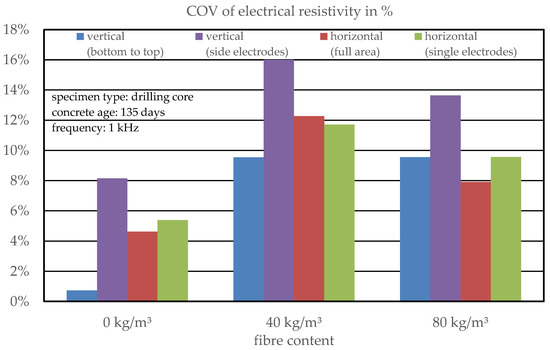 Comparing the variations in different directions of the specimens, it can be concluded that the variation in the vertical direction is slightly higher than for the horizontal direction. An explanation could be the possible segregation processes through the compaction even for robust concrete compositions, which result in small differences of the local water–cement ratio in different heights of the specimens as well as in a higher number of large aggregates in the lower zone of the specimen. In the horizontal direction for full area measurements and single electrode measurements, no significant differences regarding the variations can be detected, but it has to be considered that for the single electrode configuration, the number of measurements is three times higher than for the full area configuration because of the different height levels of the test setup. In summary, the results show that, especially for low fibre contents, but also for higher ones, several samples have to be analysed to gain robust results that allow the calculation of the fibre content and orientation of a concrete element, while for single specimens a comparably high inaccuracy can be expected.