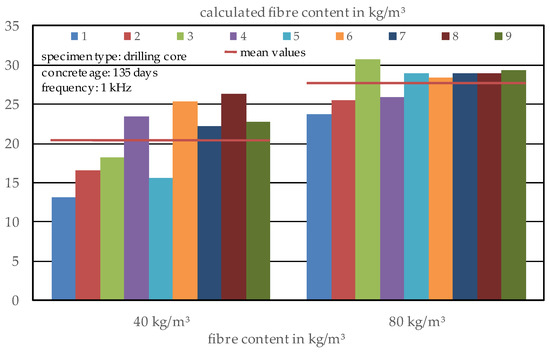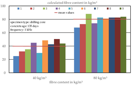 Based on the electrical resistivity, the fibre content of the concrete specimens was calculated with Equation (2). While for the cubic specimens (Section 3.1.2) for a frequency of the alternating current of 1 kHz, the fibre content was tendentially overestimated. For the drilling cores, a massive underestimation can be observed (Figure 14). For the specimens drilled of a plate with a fibre content of 40 kg/m3, a fibre content of 20.4 kg/m3 was calculated, which corresponds to 51% of the actual mixed in fibres. Furthermore, for the specimens, with a mixed fibre content of 80 kg/m3, the difference between the result and expectation is even higher with a calculated fibre content of 28.1 kg/m3, representing 35% of the expected content.