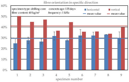 Although the determination of the fibre content seems to be problematic when no information about the concrete is available, the fibre orientation can be calculated without changes to any equations based on the electrical resistivity in different directions. As presented in Figure 16, for fibre content of 40 kg/m3, an unexpectedly high orientation factor in a vertical direction (mean value of 41%) is observed, while for each specimen, the factor in a vertical direction is above 1/3, so most of the fibres are detected in a vertical direction. In comparison to the cubic specimens, this behaviour is contrary but could be based on the large dimensions of the concrete plate where the drilling cores have been extracted from. The large dimensions lead to a high volume of concrete and thus a lower effectivity of the compaction by the vibration table, which for smaller specimens is the most influencing parameter for the fibre orientation. In addition, one can see a high scatter in orientation that reaches from 34% to 50% for the vertical and 20% to 38% for the horizontal direction. One interesting fact can be identified by comparing Figure 15 and Figure 16. Where a fibre orientation in a vertical direction of more than 40% is calculated, the calculated fibre content is significantly lower than the expected value of 40 kg/m3, which also is the mean value of all specimens. The same can be seen for specimen 8, which has the highest calculated fibre content and the lowest fibre orientation coefficient in a vertical direction. This correlation leads to the assumption that either the calculation of the global fibre content based on the three directions is slightly inaccurate, or the higher vertical orientation coefficient is a result of lacking horizontal fibres inside of single specimens. Again, a small influence of the specimen position inside the concrete plate could be assumed by looking at the results of specimens 7 to 9 with lower edge distances that show a higher horizontal orientation factor. Based on the compaction process, perhaps some fibres tend to orientate themselves on the walls of the formworks and thus are detected as horizontal fibres in the specimens near the formwork. Vertical fibres near the formwork are not detected because the distance between the drilling core and the formwork with half of the fibre length was chosen high enough not to be influenced by the walls.