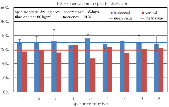 For the specimens with a higher fibre content of 80 kg/m3, the expected orientation of more than 2/3 of the fibres in the horizontal direction is detected with maximum values up to 44% and minimum values of about 28% (Figure 17). In addition, the uniformity of the specimens is much higher, and only specimen number 5 shows a significantly lower vertical orientation coefficient. A correlation of the calculated fibre content and orientation factors was observed for the lower fibre content. In this case, it cannot be seen, probably based on the more uniform fibre distribution and orientation and thus the better acceptance of the calculated global values. Compared to the orientation of separately cast SFRC specimens, the difference in the fibre orientation is clearly visible which means that the orientation of fibres inside SFRC in contrast to the fibre content cannot be determined on such specimens and a direct analysis of structural elements is necessary. Here, no big influences of the specimen’s position inside the concrete plate can be observed because of the relatively homogenous results in total. Only specimen number 5, which is in the centre of the plate, shows a significantly lower vertical fibre orientation factor, which can be explained by the flow process of the concrete through the compaction.