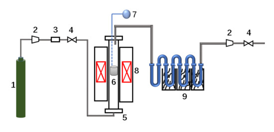 Schematic diagram of experimental device. 1. Gas cylinder; 2. Pressure-regulating device; 3. Gas drying device; 4. Mass flowmeter; 5. Pyrolysis reactor; 6. Biomass; 7. Explosion-proof alarm device; 8. Heating device; 9. Condenser pipe.