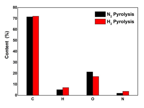 The oxygen content in pyrolysis oil is an important index of the reaction pyrolysis effect. The elemental analysis of pyrolysis oil under different atmospheres is shown in Figure 2. The experiments were conducted in triplicate for each condition, and the mean values were used.