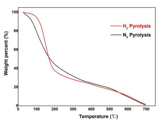 The experimental conditions of this experiment are from room temperature of 30 °C to pyrolysis temperature of 700 °C, hydrogen atmosphere pressure of 5 MPa, and flow rate of 50 mL/min. It is based on the experimental parameters of two-stage hydrogenolysis of pine leaves by Zheng et al. [19].